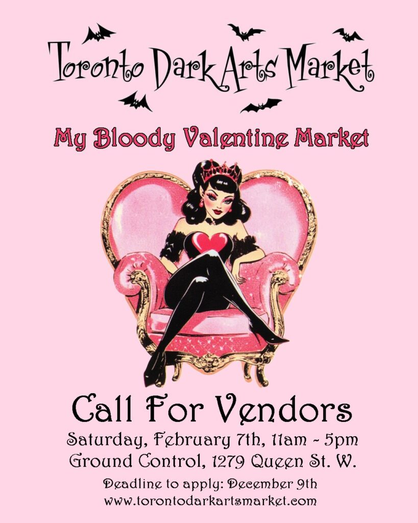 Toronto Dark Arts Market welcomes applications from creators and makers of alternative arts, crafts, clothing, jewellery and accessories, music, literature, decor, toys, and housewares, to take part in our My Bloody Valentine Market dedicated to promoting weird and wonderful ephemera for the alternative-minded individual.