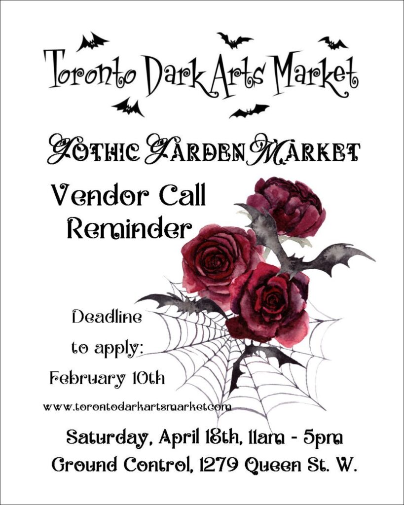 Toronto Dark Arts Market welcomes applications from creators and makers of alternative arts, crafts, clothing, jewellery and accessories, music, literature, decor, toys, and housewares, to take part in our Gothic Garden Market, dedicated to promoting weird and wonderful ephemera for the alternative-minded individual.