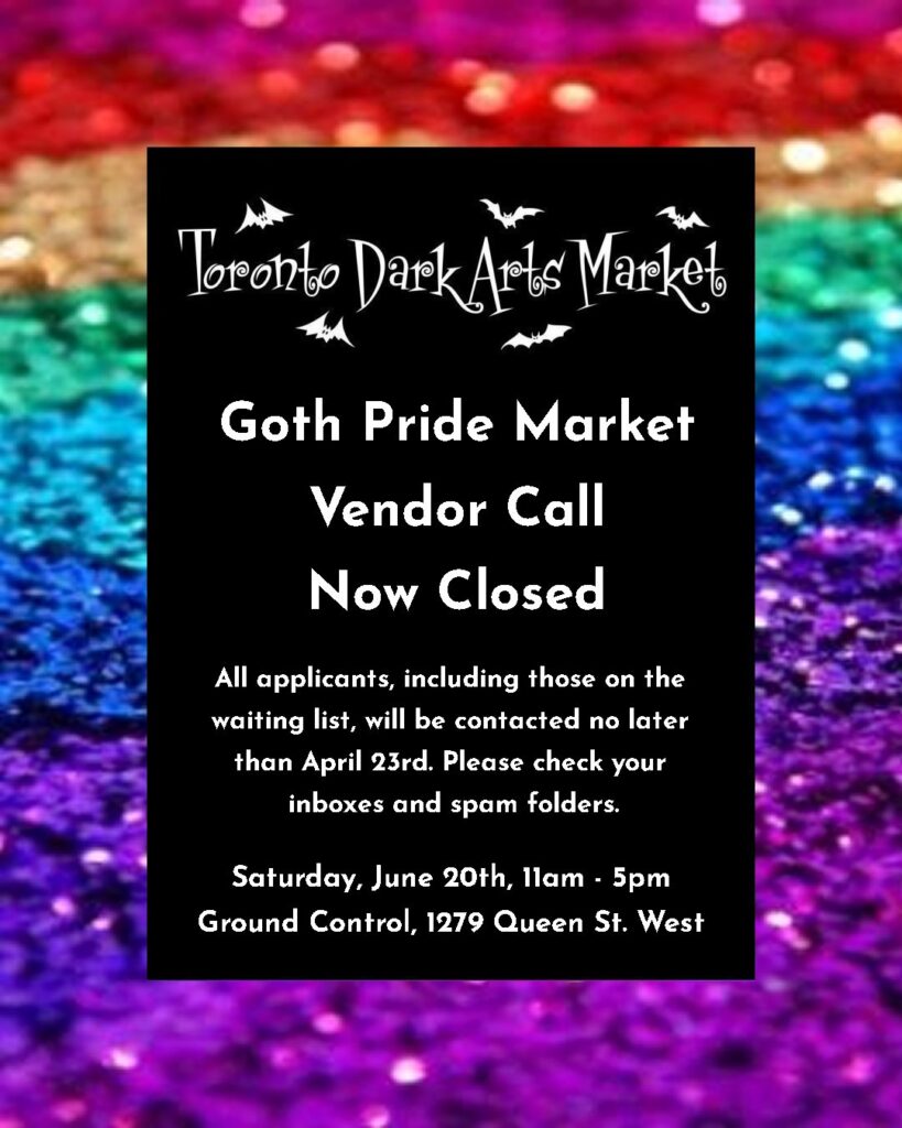 Plus, vendor call for our Goth Pride Market on June 20th is open until April 21st, so if you are an artist with a dark side but a rainbow swirl, please visit our website to submit an application to take part.